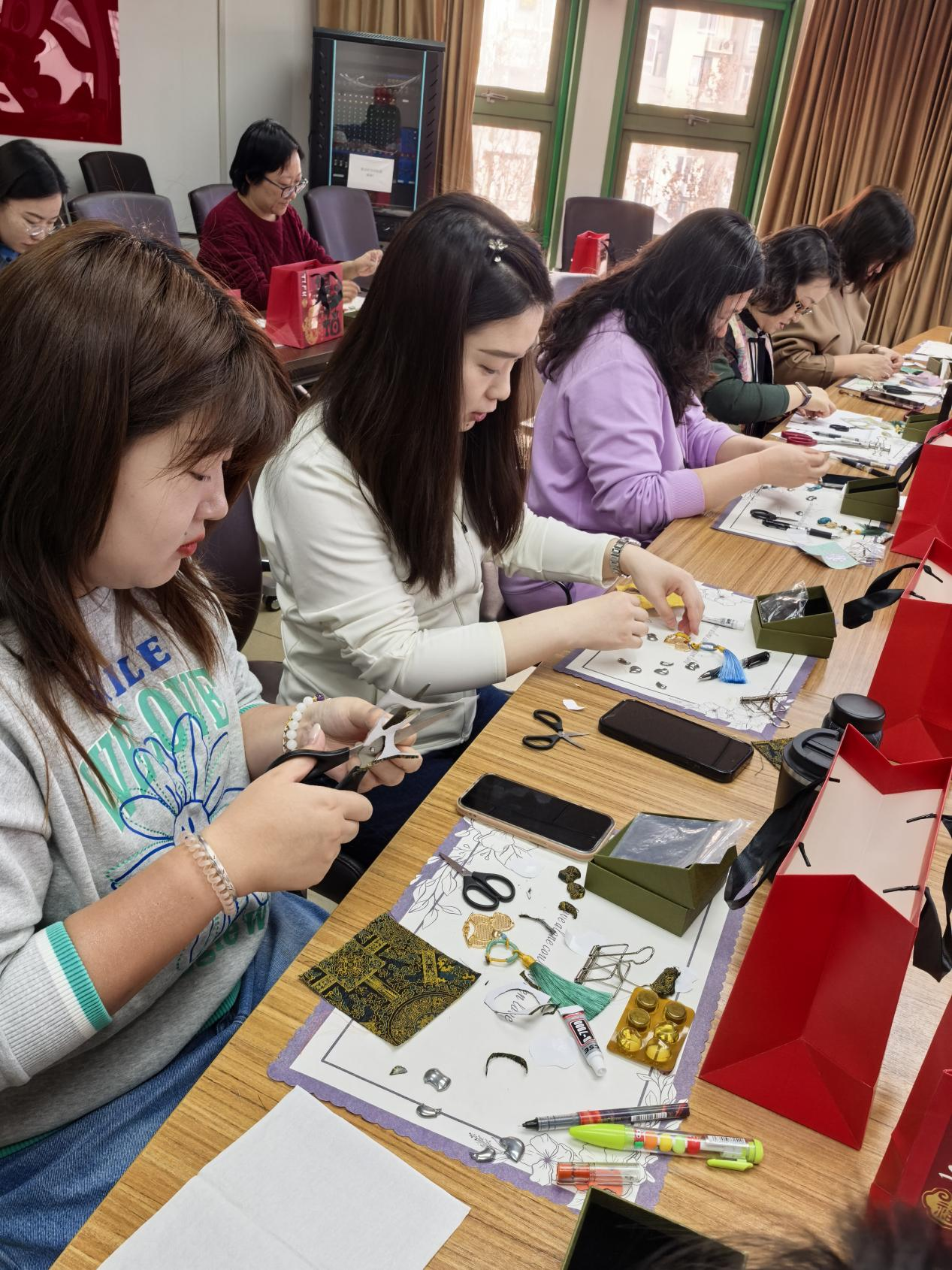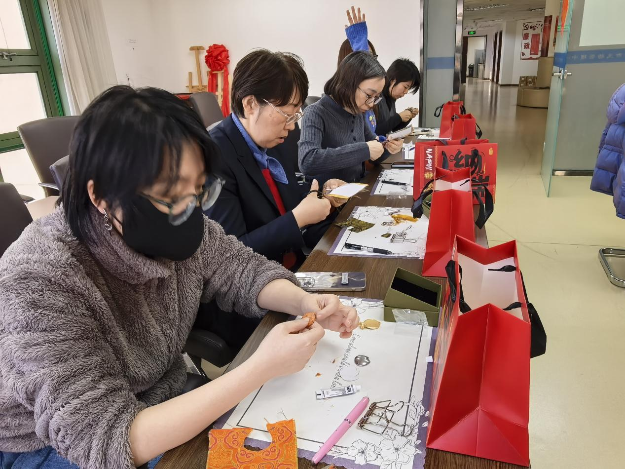 女职工们化身“手艺人”,在工艺师耐心细致地指导下,挑选自己喜欢的布料,对照配件的形状和大小,选择合适的图案,仔细将它们粘贴在底托上,再进行调整和修剪,认真制作专属自己的作品。活动现场气氛热烈,洋溢着欢声笑语。
