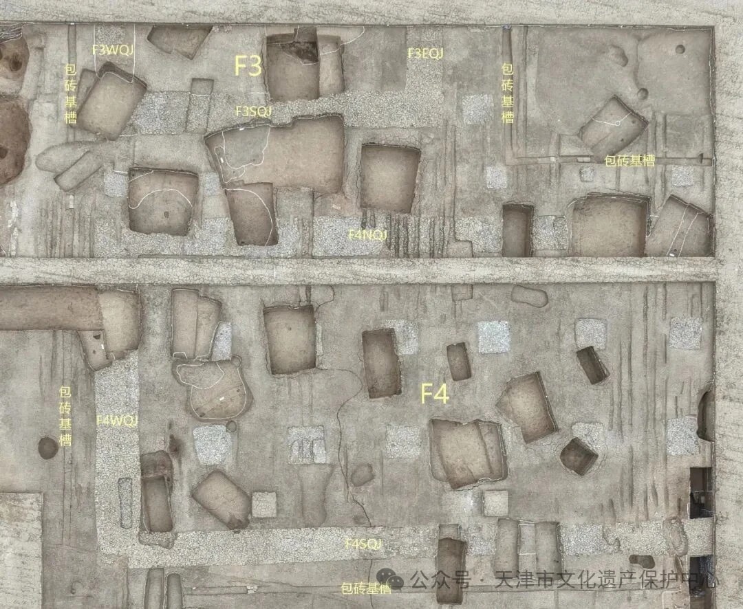 为进一步明确南仓村南漕仓院落的分布范围和结构布局,厘清建筑基址与外侧环沟之间的关系,2025年对南仓村南漕仓院落西南开展了主动性考古发掘。本年度发掘共布设10米×10米探方11个、探沟4条、解剖沟2条,实际发掘面积1099平方米,重点对2座元代建筑基址(F3和F4)局部和外侧环沟进行清理。在着重发掘元代遗迹外,还清理一批清代墓葬,元代建筑基址下还发现有大量战汉及以前文化堆积。