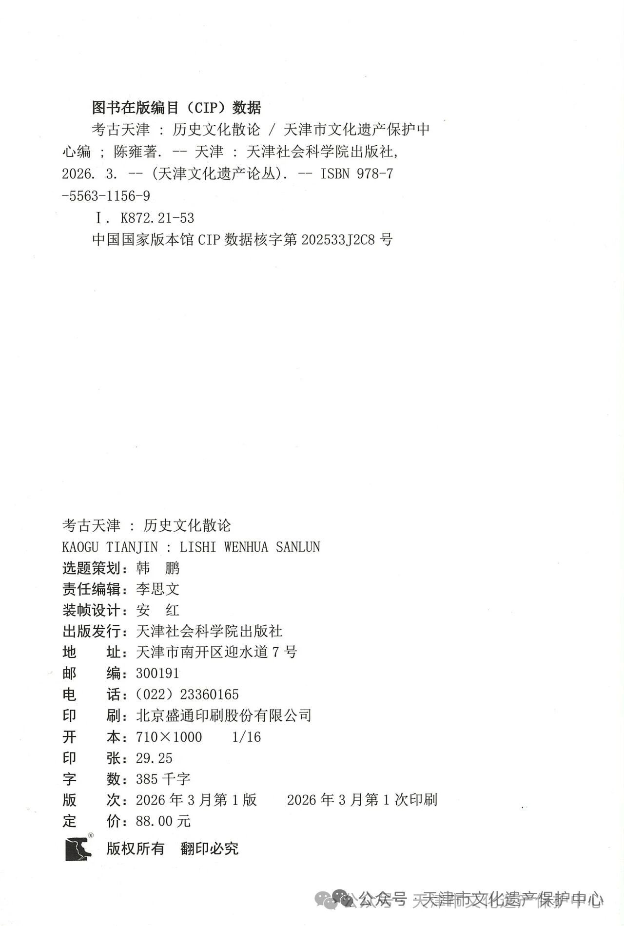 近日,天津市文化遗产保护中心编、陈雍研究馆员著的《考古天津:历史文化散论》,已由天津社会科学院出版社出版。